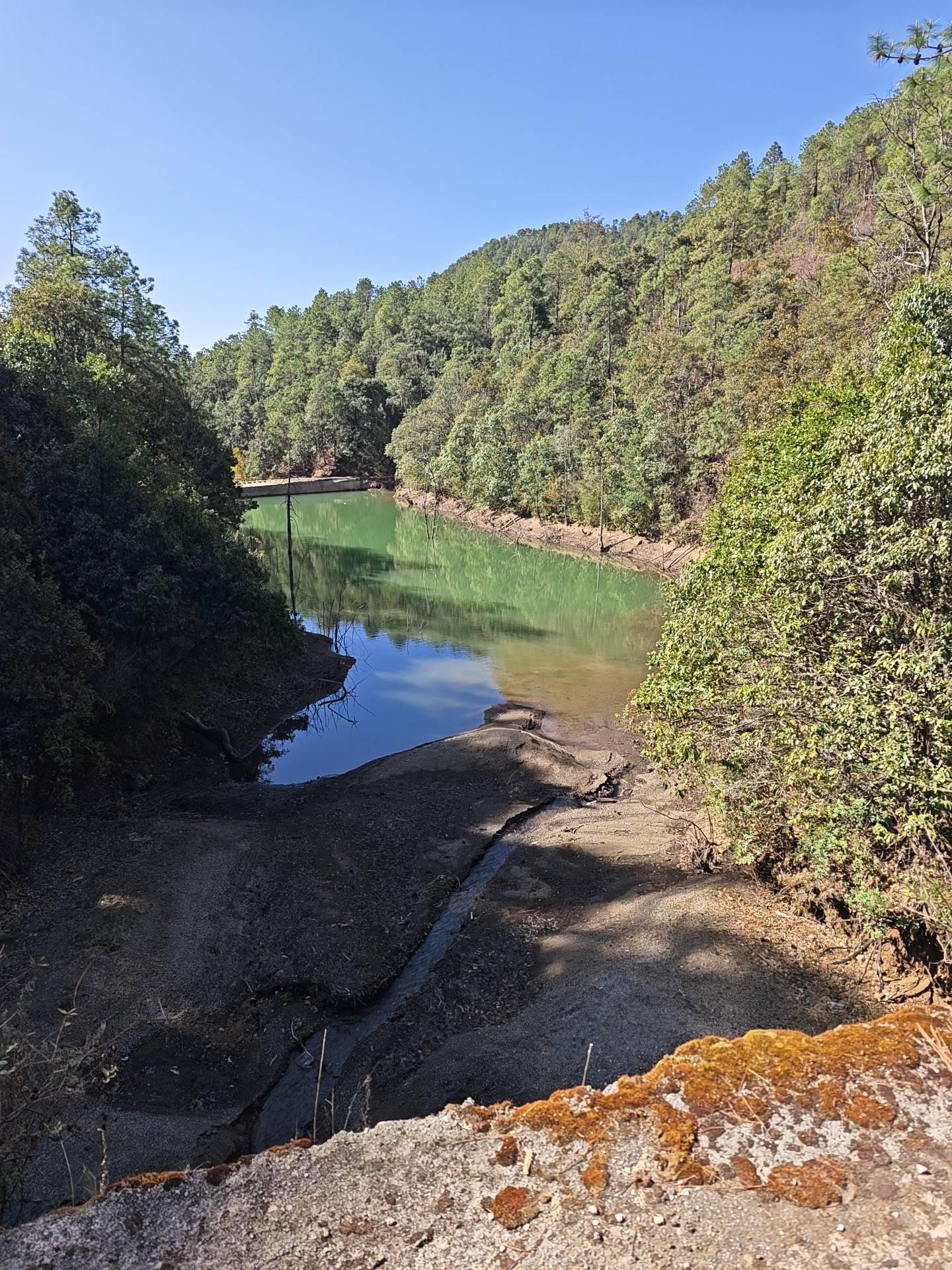 这段路帮我躲过了水泥公路的弯道,在它转为顺直时,适时汇入。我沿公路走了一会儿,看到了左侧一条未铺装的大路,按照设计,我在此左转,切过沟底,走上沟西侧这条更为曲折的步道。沟底筑了一道坝,水从坝下面的涵洞中涌出,形成一个小瀑布,落入坝下的水库中。