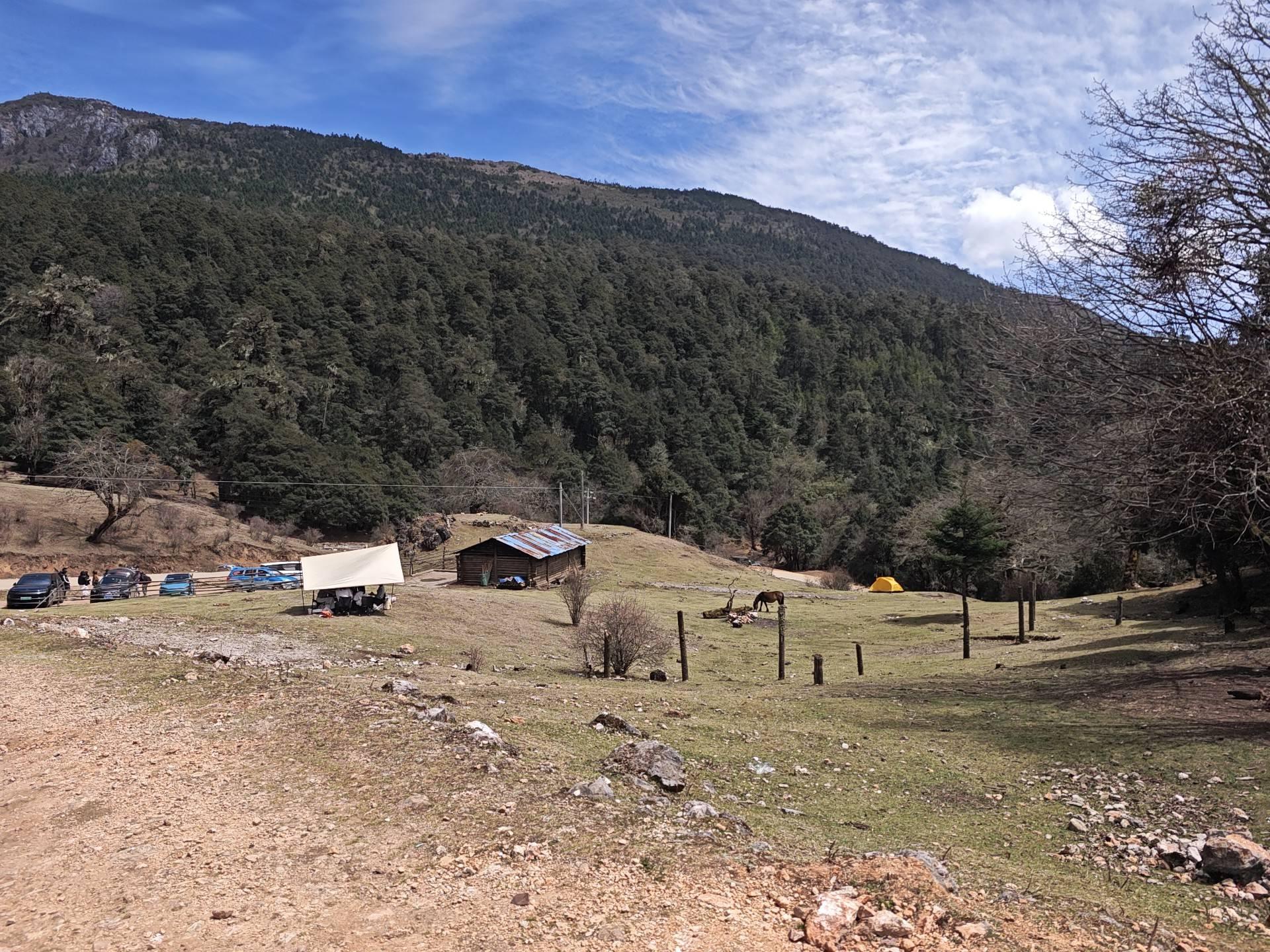 这条防火道快走到尽头时,我听到喧嚣的人声。前面停着若干辆车。一片空地上上,搭了一个硕大的凉棚,棚下面冒着烧烤的白烟,我似乎闻到了羊肉和孜然的味道。外围树着栅栏,几个木屋正在施工中。另一处草甸上,自带的天棚下,几个游客正围桌野餐。
