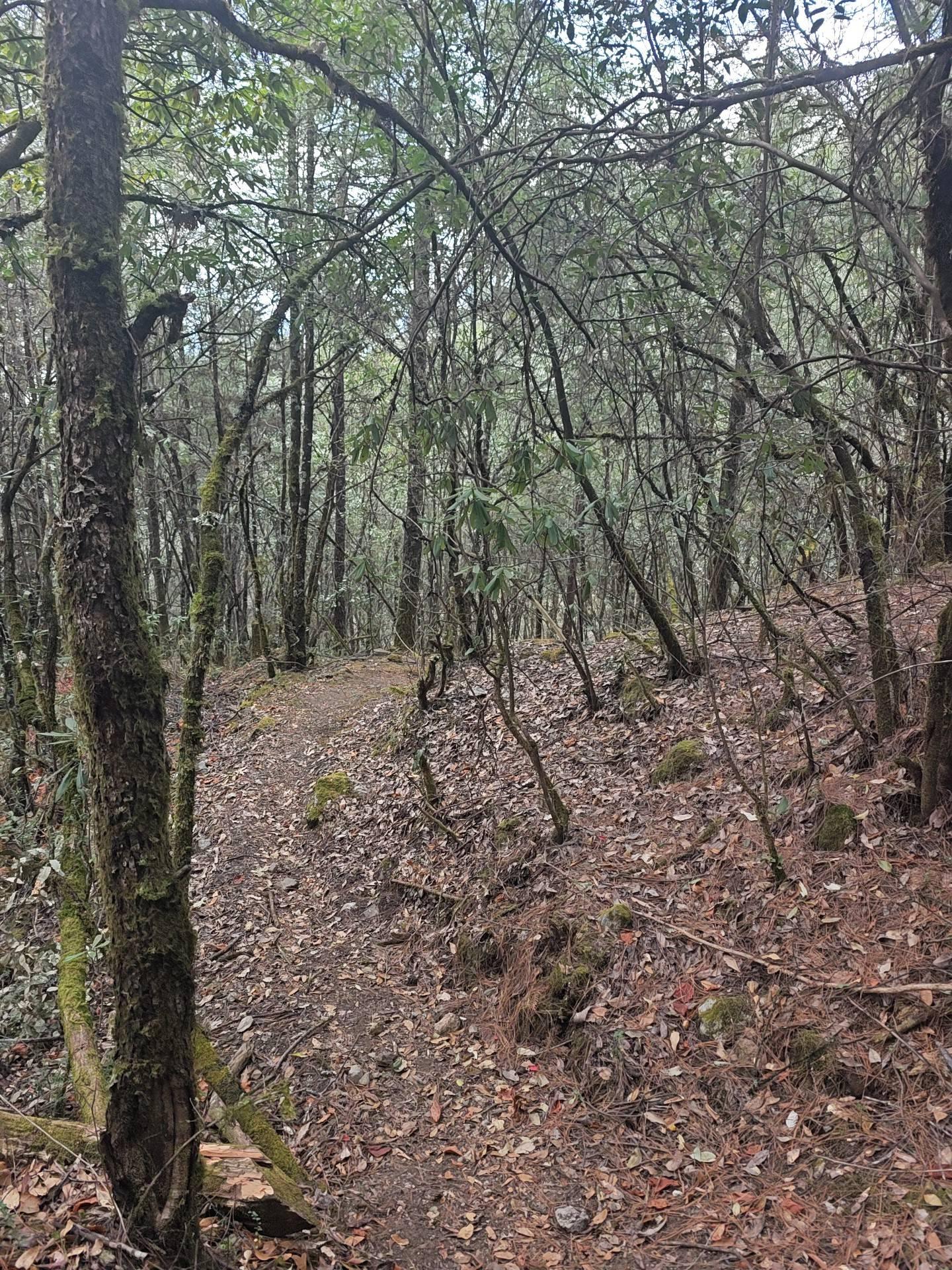后面的路基本上完全忠实于规划路线,弯道多到让人产生一种一辈子都走不到头的幻觉,幸亏有《二的三次方》相伴,听刘宏伟如何用初中化学知识刁难一众学渣主播和一个正上高一的学渣观众。这一段12公里的路程,没有任何投机取巧的机会,没有发现任何一条捷径沟通不同高度的弯道,林木倒不是很密,高大的乔木间,空间还是很通透的,可能是海拔太高,热量不足,那些灌木和藤蔓不容易发展自己的种群,没有发展出小路,主要是走的人太少了,只有护林员偶尔光顾一下。走在这样宽阔的大路上,我根本没有机会碰到山蚂蟥。