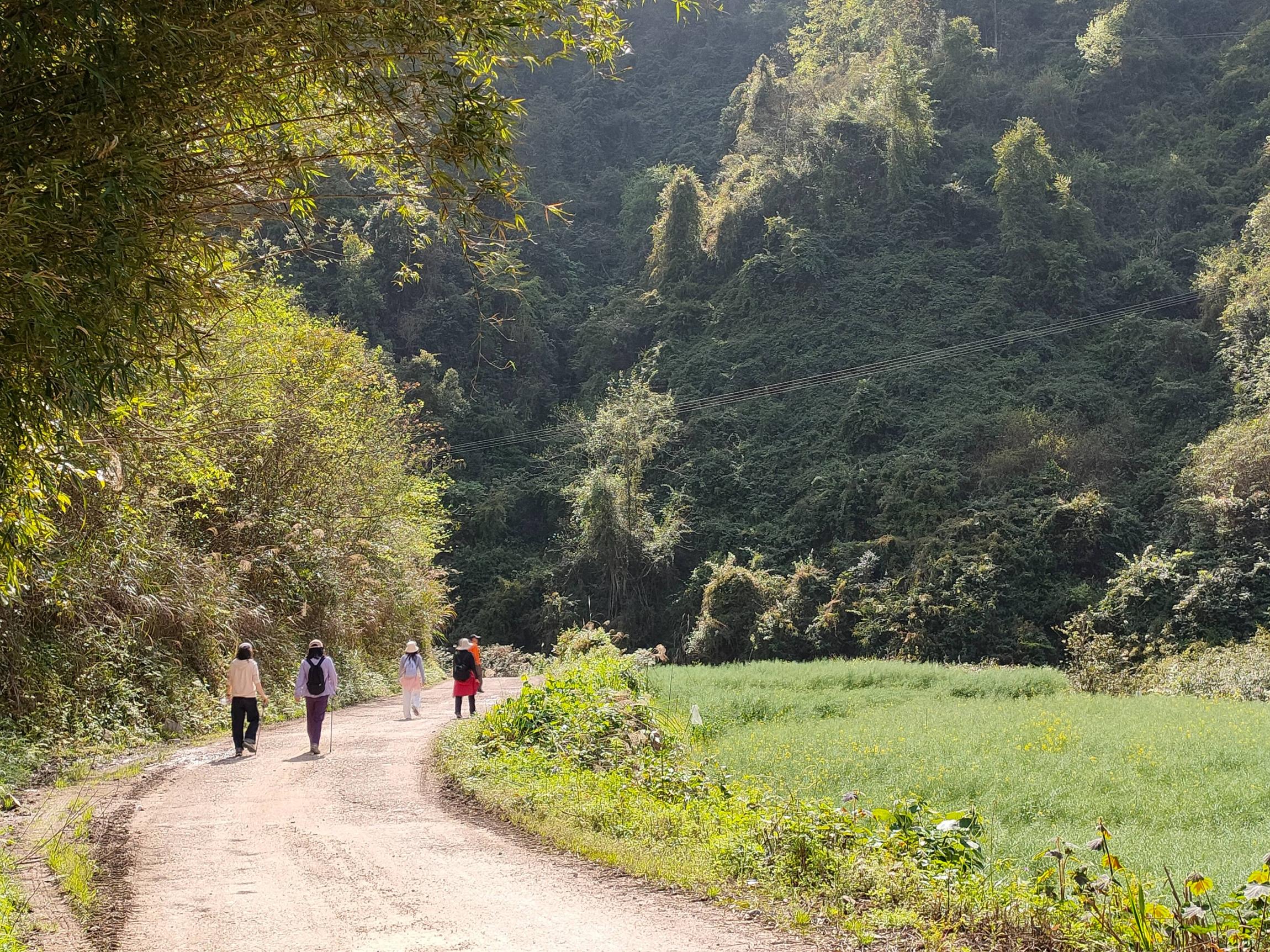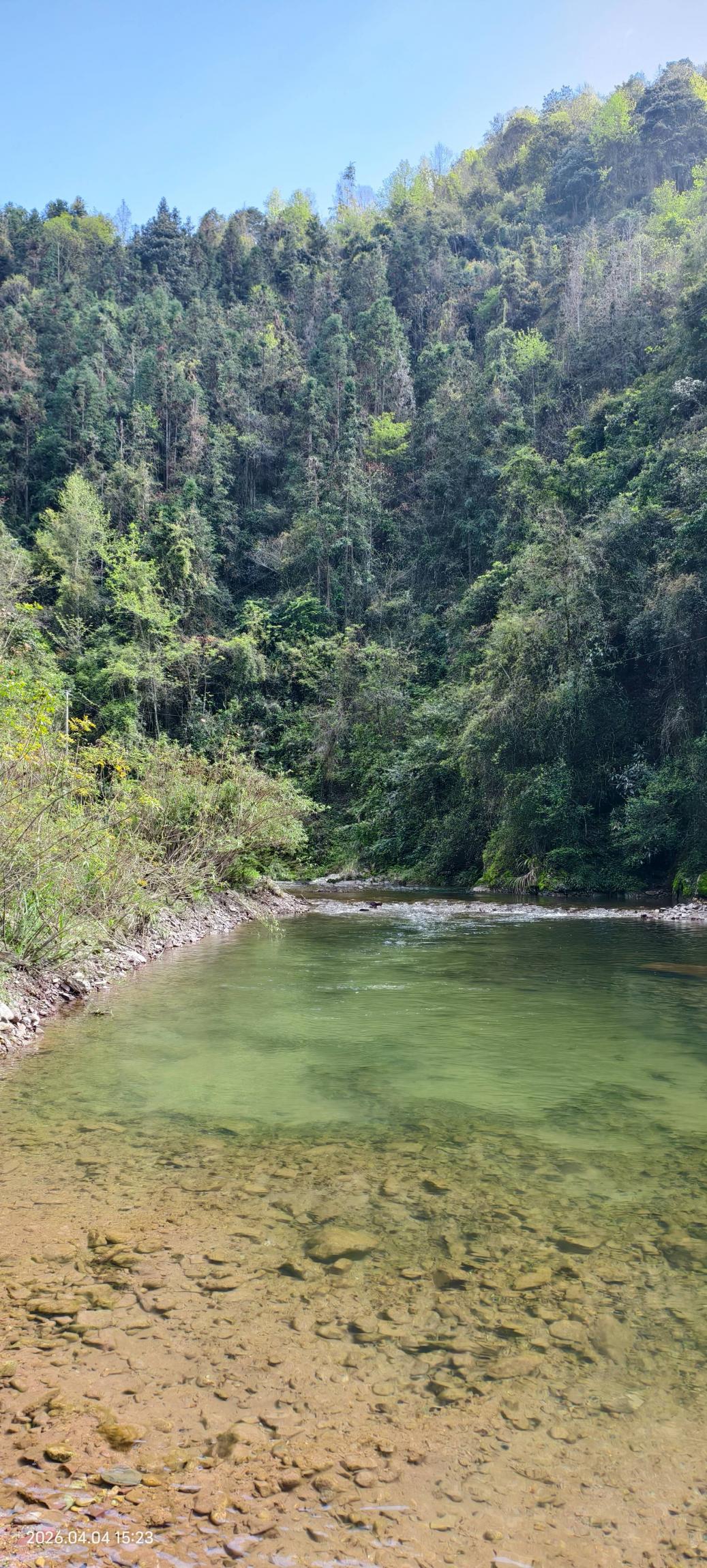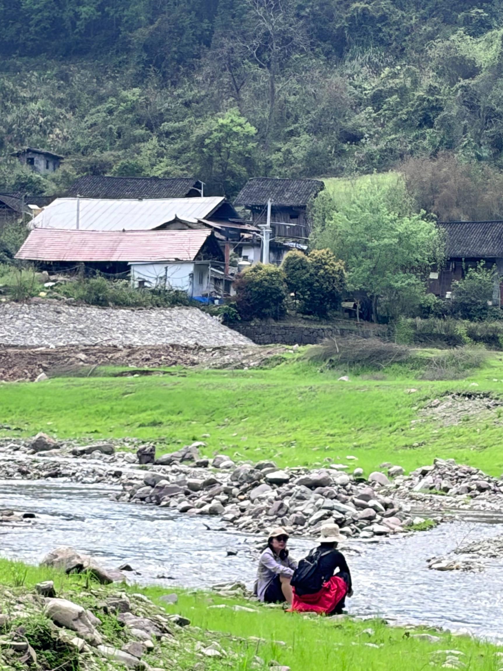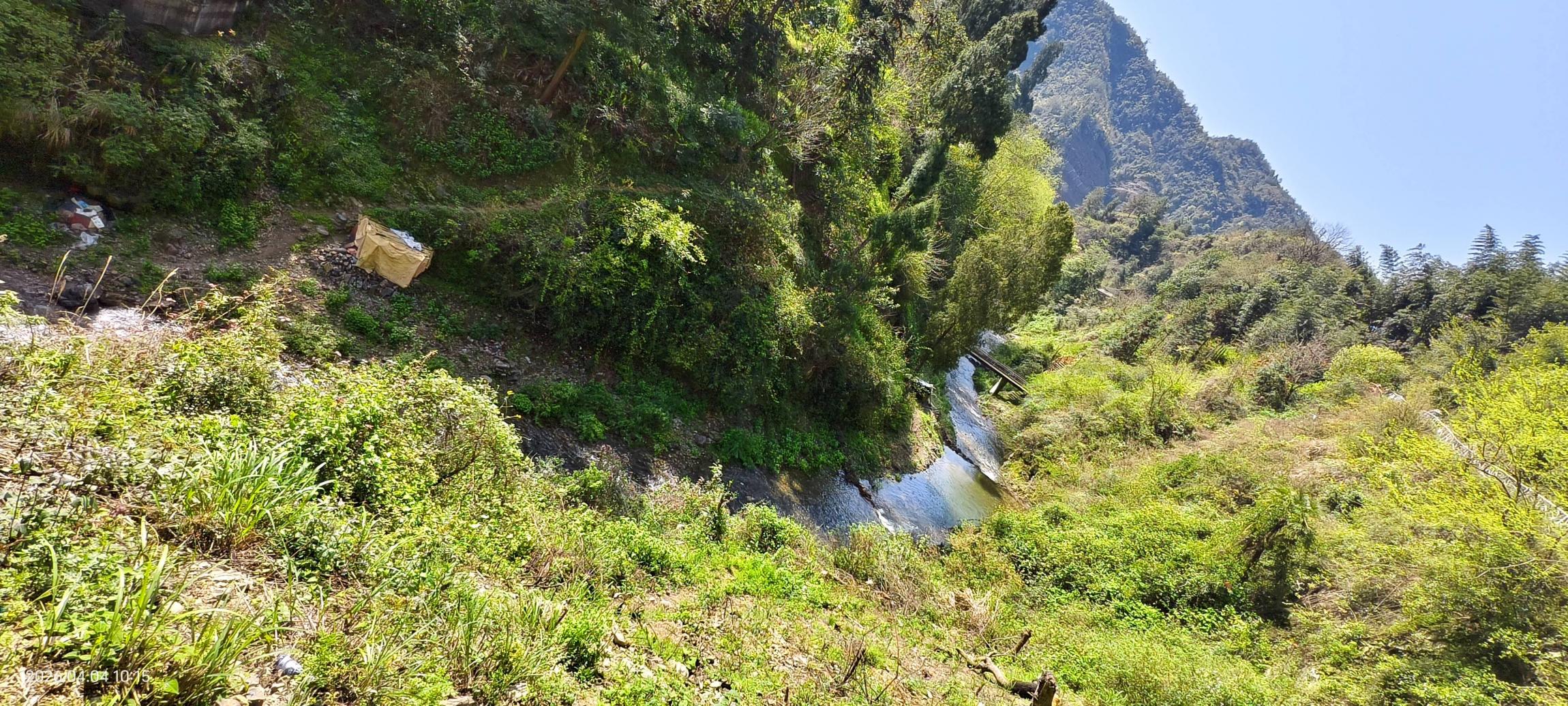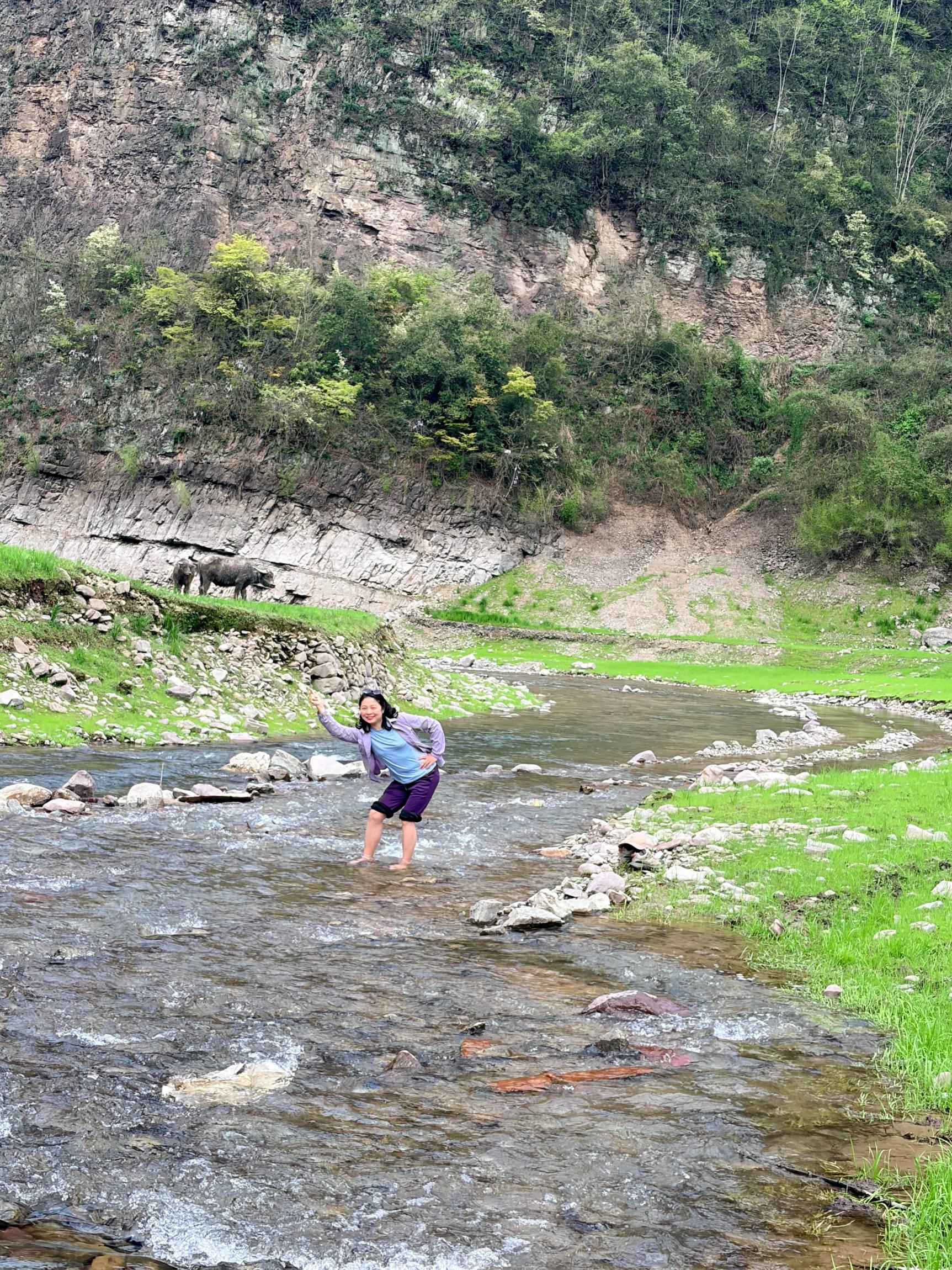 赶到穿河谷已经是中午了,印入眼帘的是满目皆是清新绿意,芳草连天,清溪蜿蜒。我们沿着溪水徒步,脱了鞋下水,春天的溪水有点凉,但是这种清新的感觉,所谓天地澄澈,不染俗尘,就是这种心情和意境。