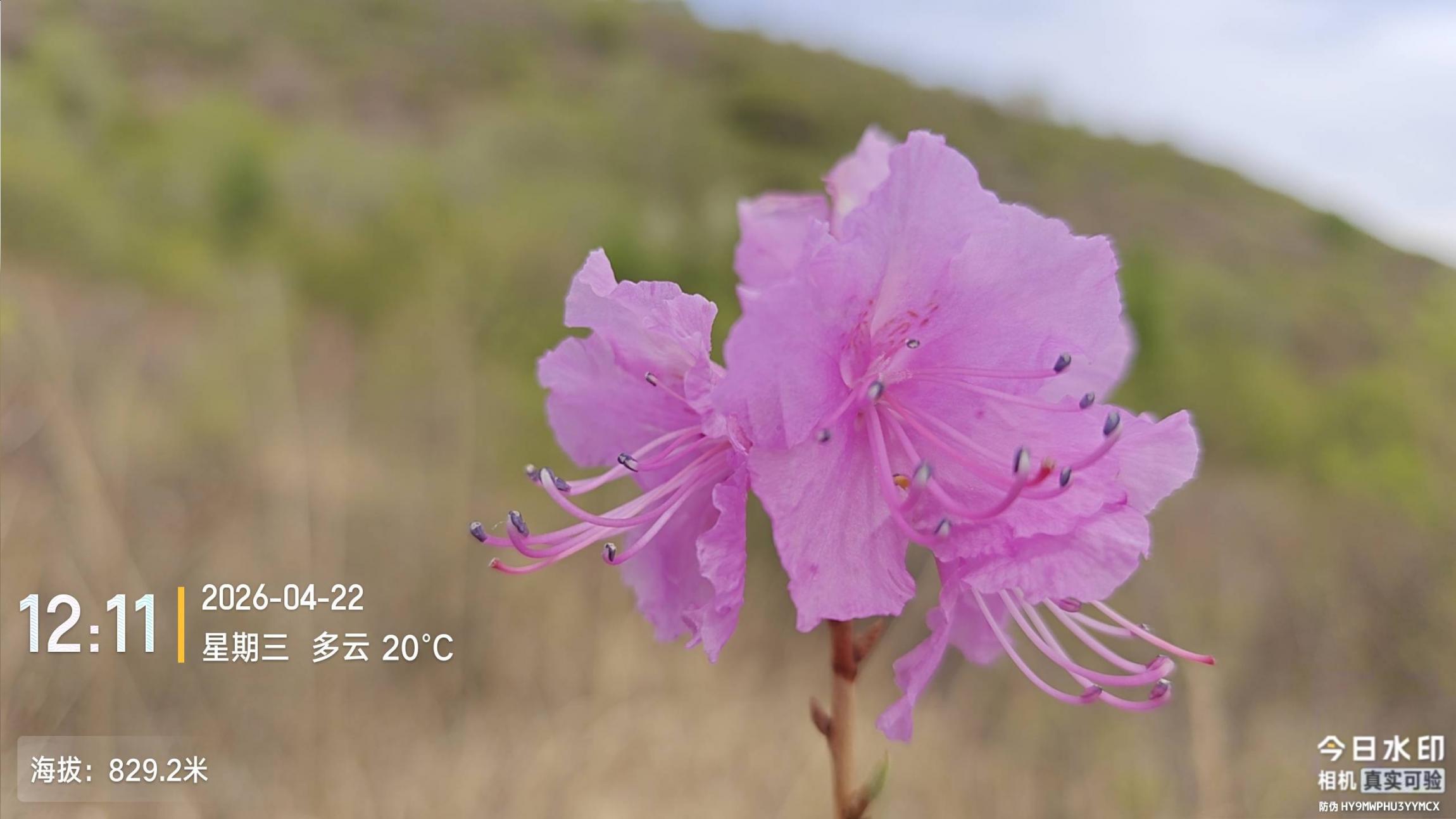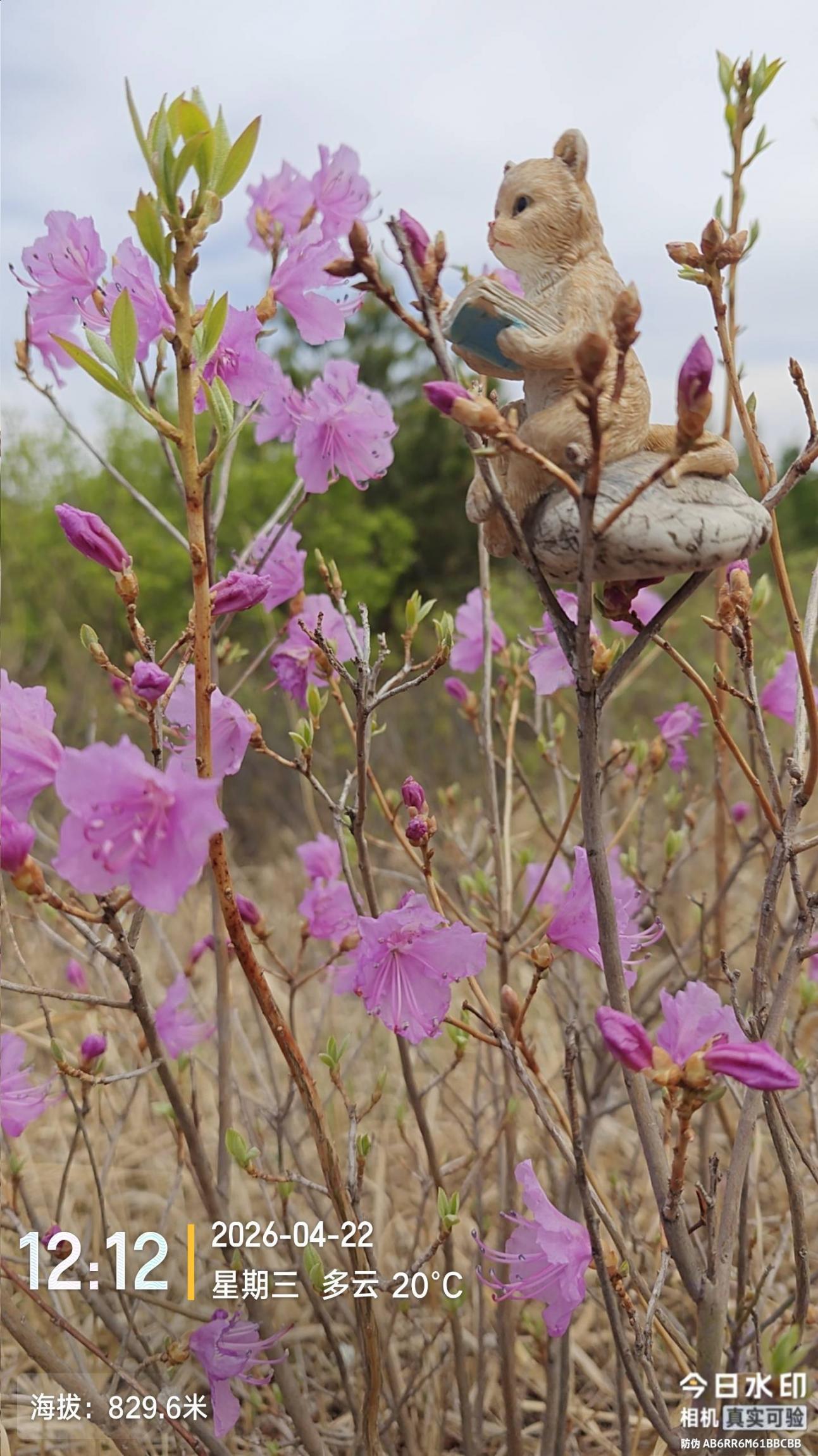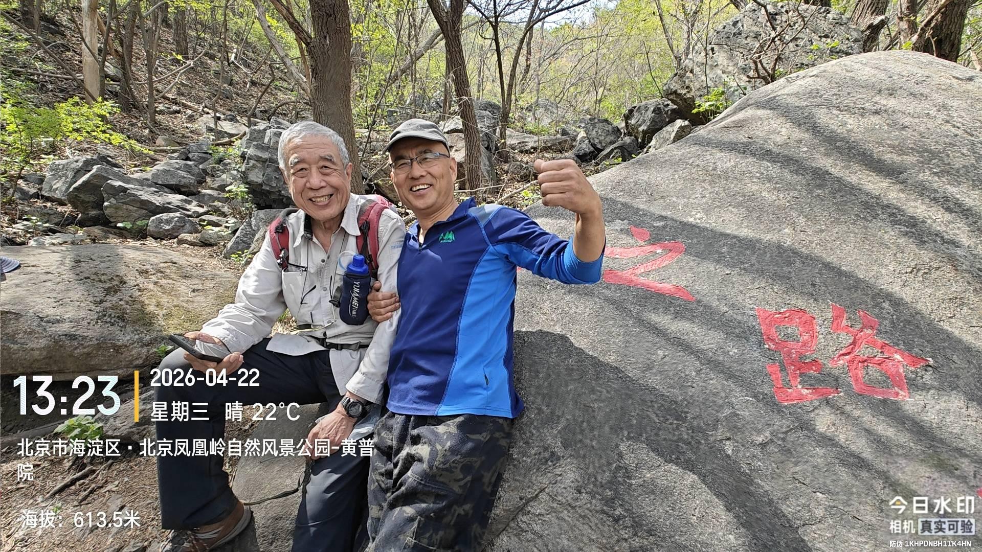 2026-04-22 聂各庄公交站-观景台-凤凰岭公交站 从聂各庄公交站出发是 7:30 ,细看了石门,有文保牌的门楼前面有好多脱落的石构件还没有还原原位。到观景台是 11:38。这之前的山脊路是飞鹰队经过四批次队伍修成的,工作量相当大的。 蜂窝玛尼堆西侧看到了唯一一株杜鹃花 ,植株不高,代表性很大。小风口石桌子旁边有个武工队戴墨镜的长者午餐着。 在水之路石刻处休息,那位长者从山路上下来,我打招呼说看着您面熟呀,老人家说:“出走社的”。之后话题就多了,关联若干走友,这里可以省略两万字。 15:40 凤凰岭公交站结束活动,和西山老农一路同行,期间还共同拥抱了车耳营关帝庙千年大松树。