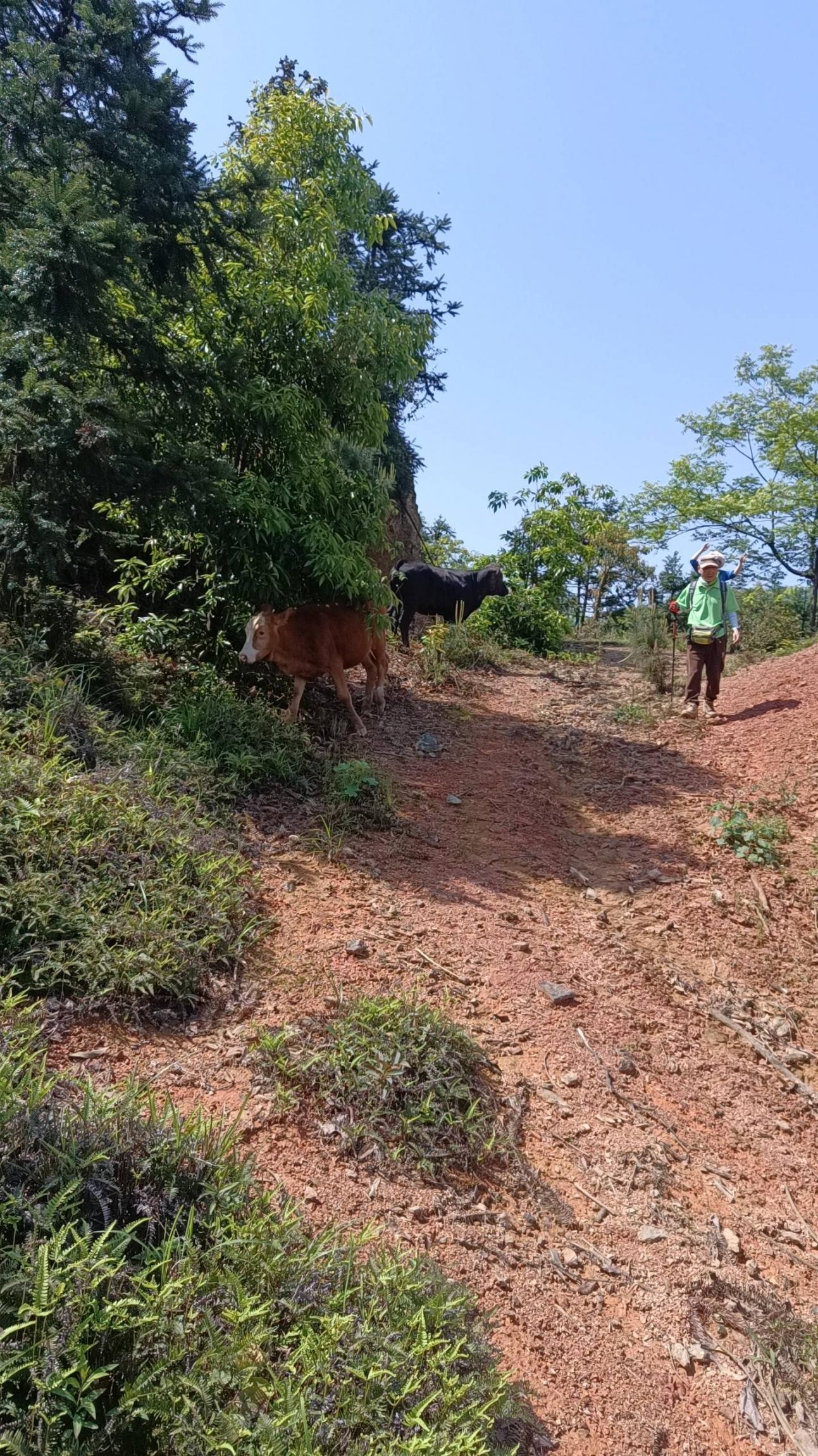 沿着山路上到山脊,在山脊交叉口发现野茶树,横向半山腰,有牛带小牛在悠闲吃草。
