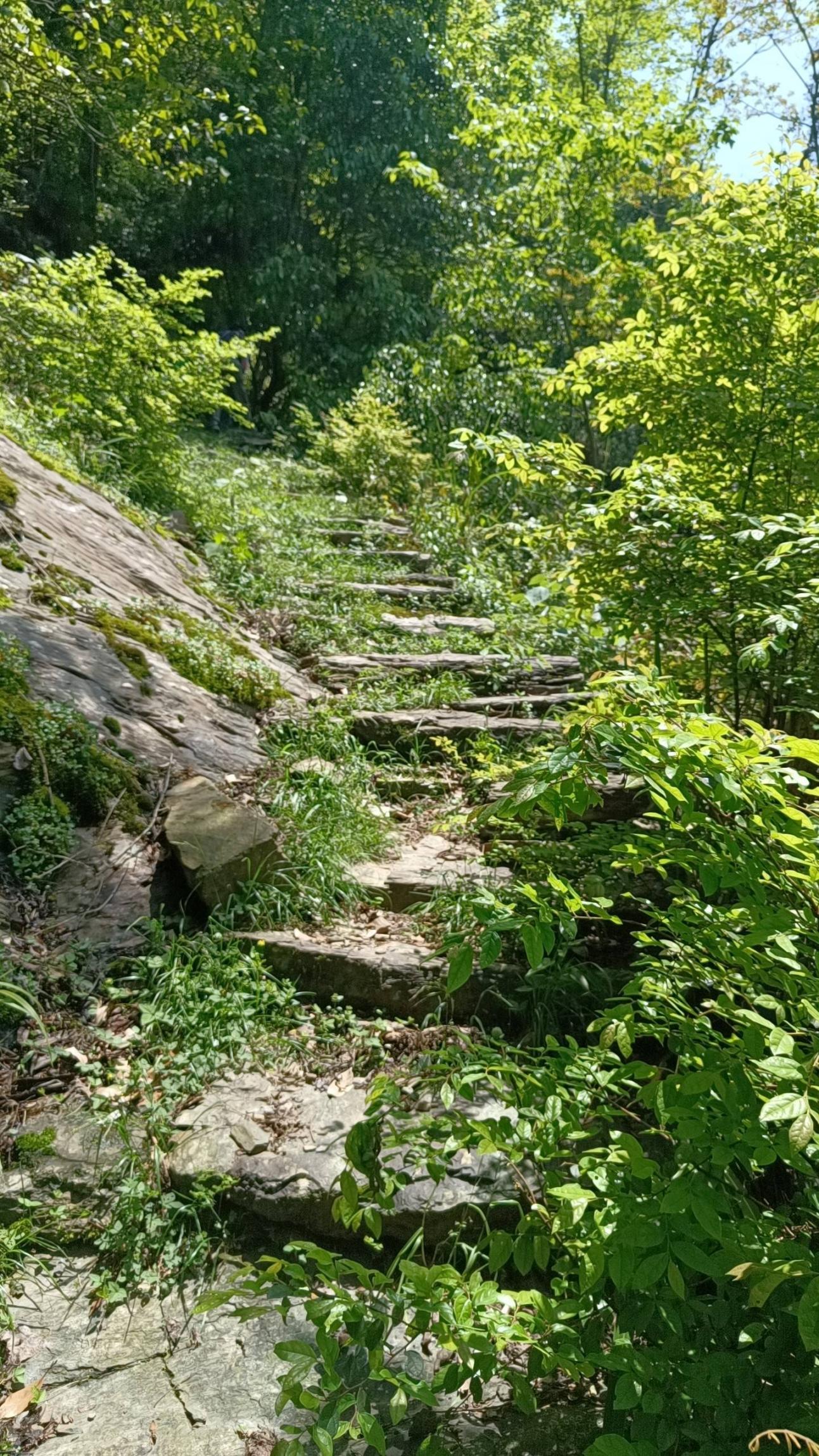 腰线尽头,下到另一边峡谷,峡谷野性十足,小桥流水,断壁残垣,麻石板路,飞流瀑布。