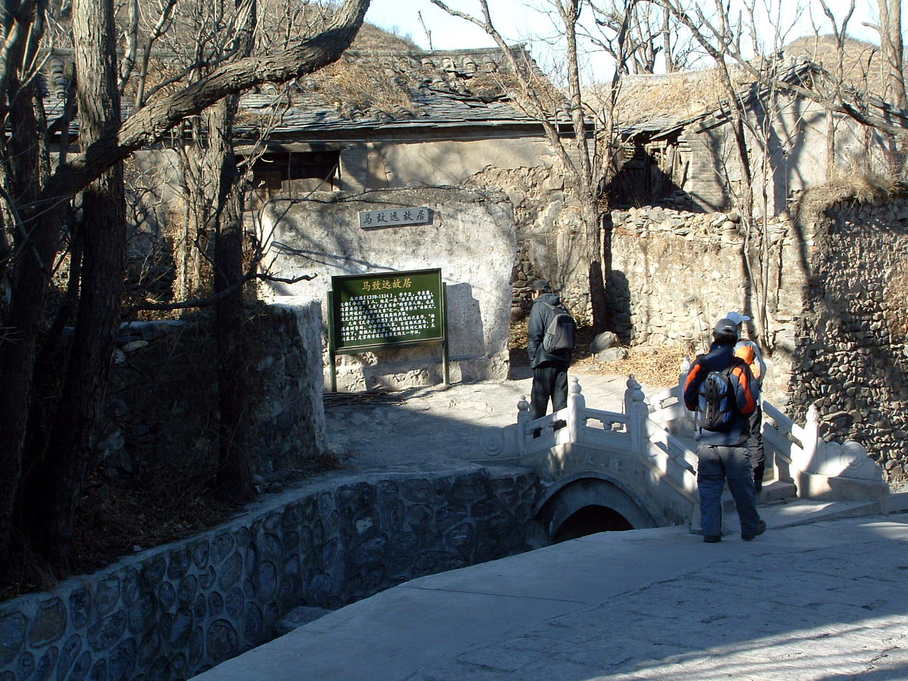 马致远故居到了。是一个快要倒掉的宅院,看建筑风格,应该是明清时代的遗物。除了墙外的牌子记载这是马致远故居,好象没有更多证据了。西秦的文章中提到马致远籍贯有河北东光和大都两种说法。我在网上搜了搜,东光说是有马氏族谱为据的。不知门头沟这个有什么证据。我怀疑,十有八九,这是门头沟旅游局的同志们策划出来的。他们的思路可能是这样的,首先,假定马致远是大都人,也就是北京人。其次,古道西风瘦马,说明,马家在京西古道边上。然后,小桥流水人家,京西古道边,哪个村子水源较丰富呢。最后,这个村子要有较多的姓马的。最后,他们找到了落坡这个村子。而村子里恰好有处破房子。于是“马致远故居”这个牌子就堂而皇之地挂上了。并且,为了与“小桥流水人家”相吻合,人们还在“故居”前修了一座小桥。其实,那是条排水沟,不到一米宽,一步就跨过去了。