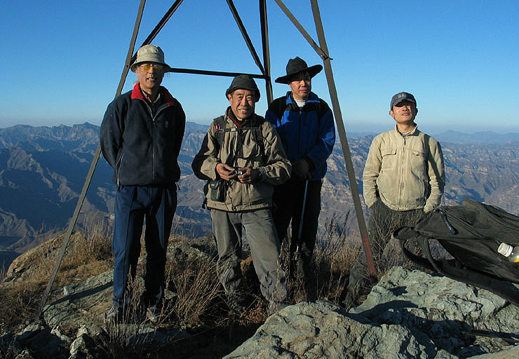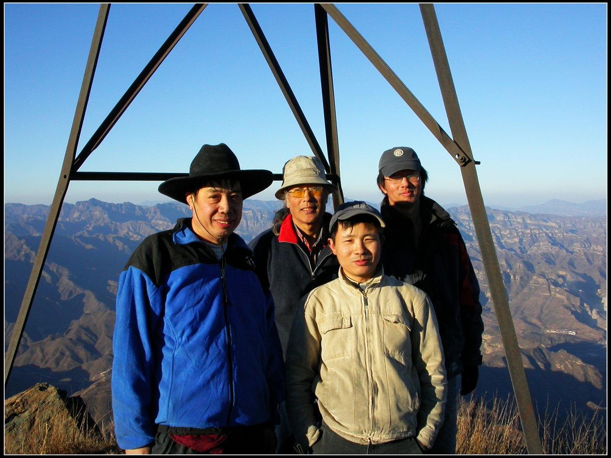 我坐在最高处铁架子处等了一会众人才上来,吃东西、合影、找路下撤。西山老农作为老同志,不仅身体状态让人佩服,并且礼数颇佳,下降的路上趁着手机有信号,拨通了欧体的电话,知道他们两位已经安全下山。经过了一处明代的叫连泉禅寺的寺庙遗址后,俺看天色将晚,自己又没带头灯,于是头一个采用“模糊箭步法”大步向前、急速下降。下降的小路是沿着一条山沟,估计夏天的时候沟里应该有水,小路在沟的两侧不断做Z字切换,有点象小五台东沟的路。