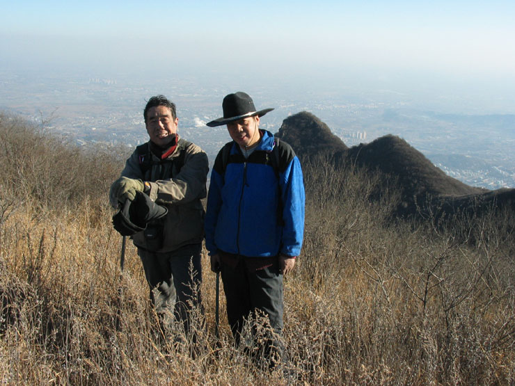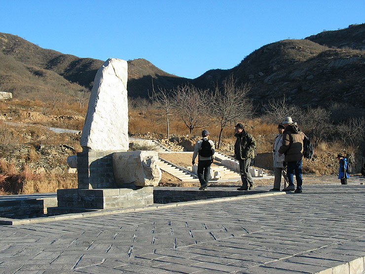 今天这种韵味我是感受不到了,山下就是燕山石化的厂区,空气中不是飘来一股臭鸡蛋的味道,浓郁到连我这个鼻炎患者都能领略出来了。照看金陵的人也不太友善,当我们在睿陵周围发怀古之情的时候,远远听到远处有大声的呵斥叫骂之声,离的太远,没太在意,后来看到一个悍妇带着一条大狼狗象我们奔来,嘴里还是大声的呼呵,情绪异常悲愤激昂,后来听明白了,她的主要意思是嫌我们照相了,她既不表明身份也不说明目的,只是大声叫喊做敢斗拼搏状,企图以一人一犬之力把我们七个老爷们震慑住。俺们都是经常爬山的仁义之人,不愿意与她计较,只好尽快离开,这种不友好的姿态显然败坏了我们寻幽仿古的兴致,让我们不能心神淡定的选择去往计划中的大房山脉云峰山的路径,霉运由此开始。