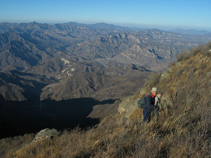 欧体和流水两位山友下撤后,不甘心就此罢休的5位队友继续向前,有了退路,情绪变的明显好转,西山老农和队长还在不停的总结关于地形地貌和测绘方面的问题,真是难为两位了,如果是战时建议把两位技术派的高手直接调总参工作,好人尽其才。终于上到山脊了,两边的景色无遮无挡、一览无余,在山脊上行走还是很惬意的,不过还是要抓紧时间,冬天的太阳落的是很快的。虽然有路,可好象长时间没人走了,时断时续。事后煽木老哥对我当时行走的速度之快表示了疑惑(因为我平时都在队伍的后边),今天例外,我后半程是一直冲在最前边,兔子急了还咬人呢。