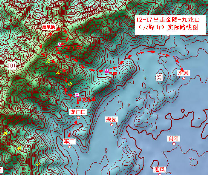 灌木和尘土,本是探路的必修课。但今天,我的队友们似乎特别的敏感。也许他们对金陵的失望,要发泄给似乎无边的灌丛。其实时间尚早,方向和地形脉络也尽在掌握之中,厂房和村落始终未远离视野,按说不该有夜宿荒山之虞。但不安和焦虑却在队伍中传染。能说什么呢,解释和激励都意义不大,我只能将信心诉诸行动,坚定地向上,向上。我知道,上了山脊,一定会水落石出。