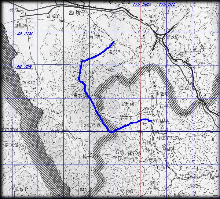 图中上部是延庆县,下部是昌平县,左边是北京与河北的分界线。蓝色线为我们大概的行走路线,仅供参考。