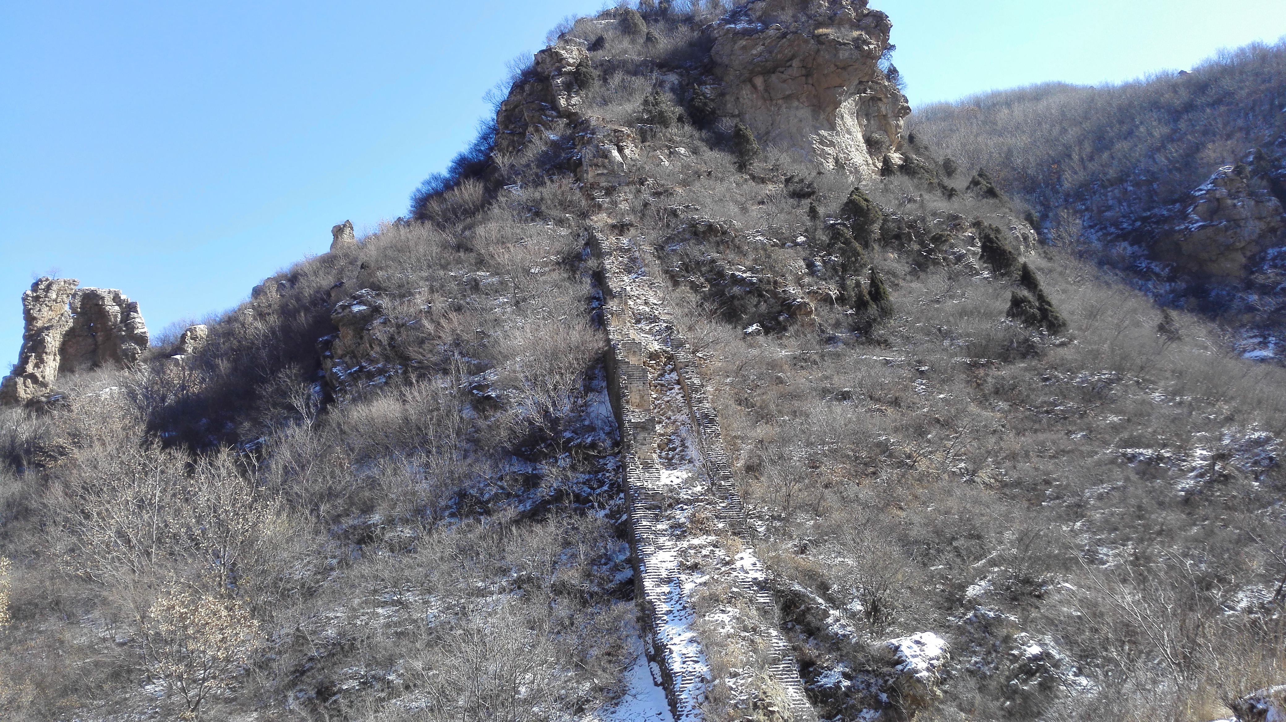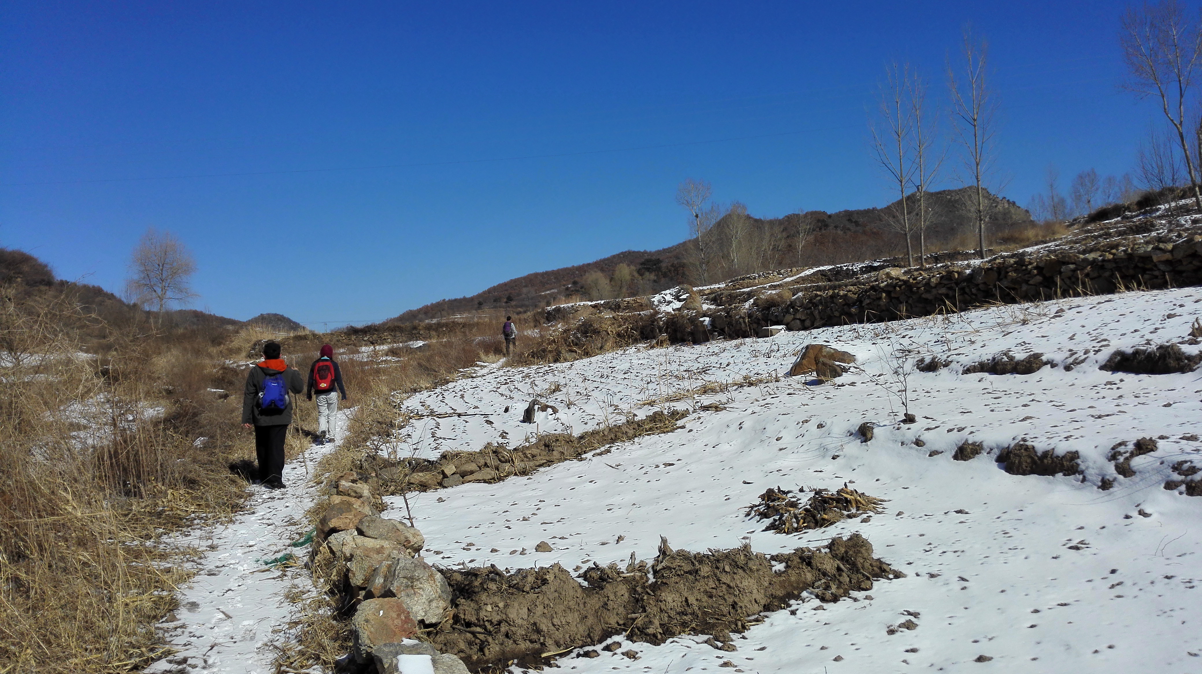 大角峪位于密云县东北角,与河北省承德县相邻,村北侧东西向山脊与司马台、金山岭一脉相承,山顶有明长城,一条公路穿村而过,通往河北涝洼村方向。这次的路线沿大角峪村西侧山谷展开,逆流而上,至山谷的源头,与长城相切,跨过长城,就进入河北境内,紧挨长城的五道梁村是山间的高地,村南侧山坡上开垦了大规模的梯田。路线穿过梯田,沿一条盘山公路向南,翻过山脊,下降至铁鸡营村,与大角峪-涝洼公路相接,再右转,沿公路走回大角峪。五道梁之后的路段我曾在2012年5月1日走过一次,之前的路段为探路性质 。