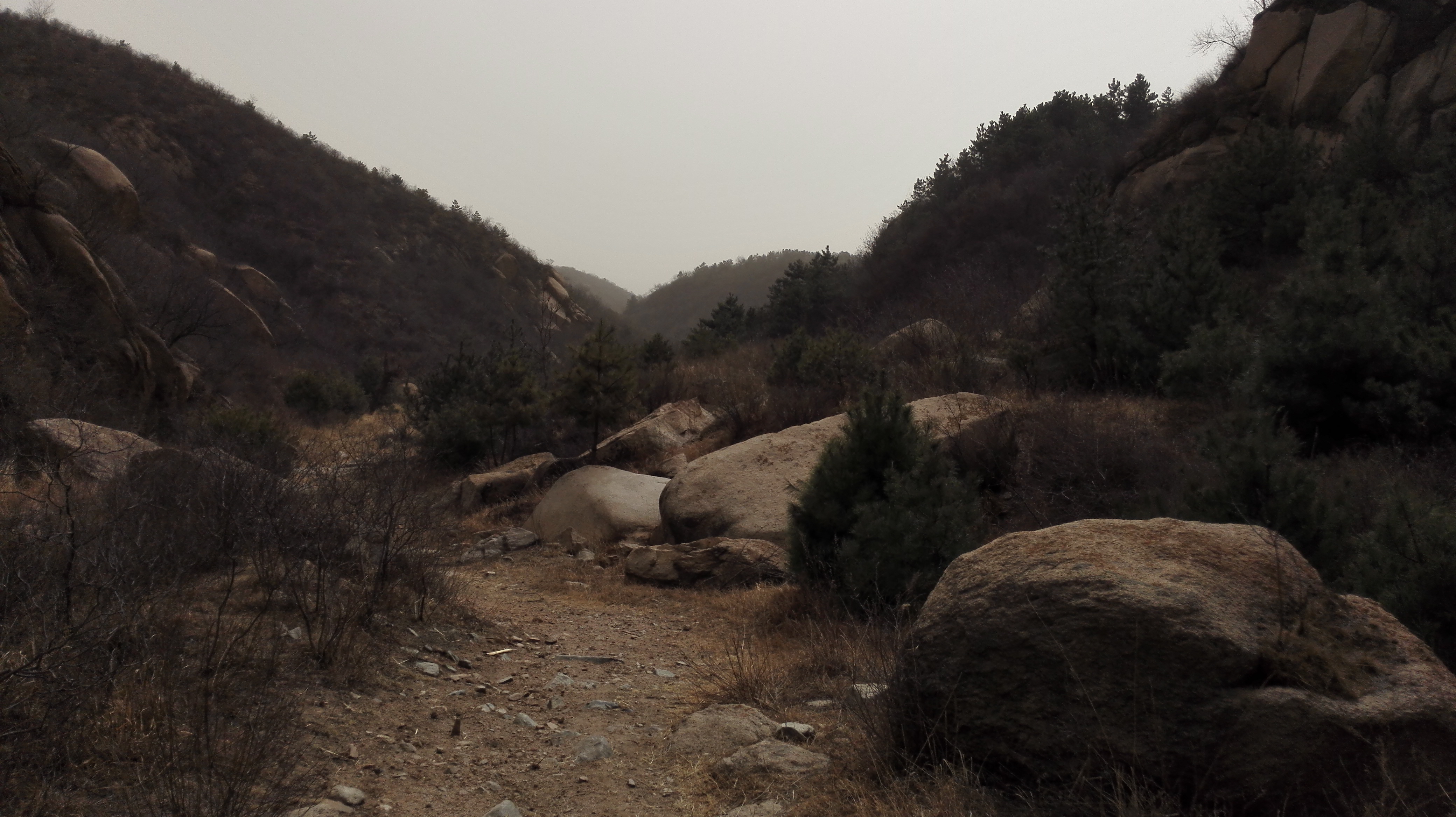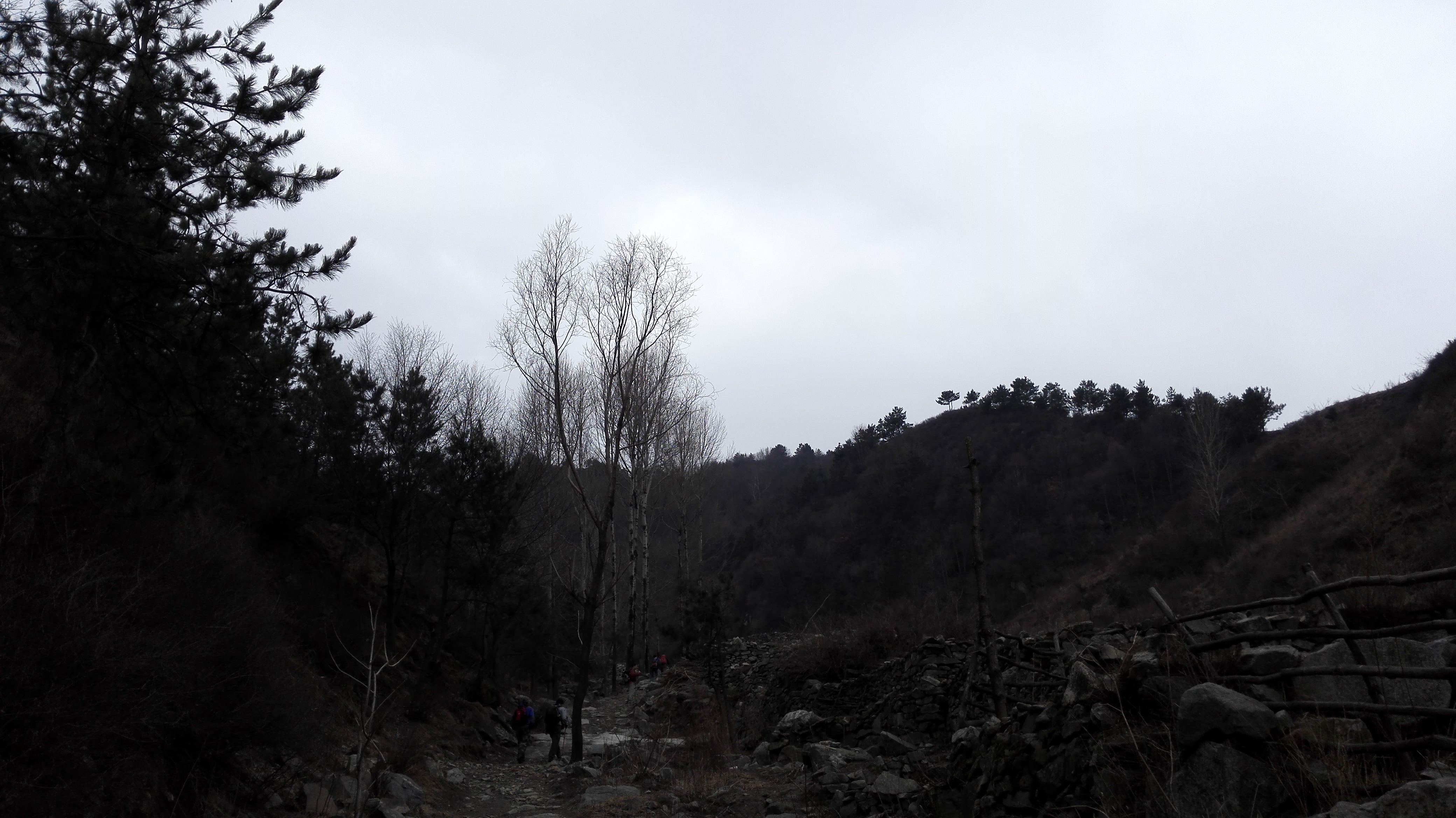 路线起点是二道河路口,沿110国道辅路南下,至莲花滩,右转,与莲花滩-孟家窑-箭杆岭台地擦一个边,然后左转,进沟,顺流而下,至两沟交汇处(这里是很好的野餐地,草甸、溪流、大石头。。。不过时节未到),右转,沿麻地沟上升,至垭口,下降到沟里,穿过长城脚下的公社,至水关,右转,沿八道岭高速辅路走到八达岭,解散。