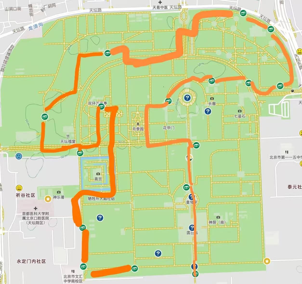 本次寻宝完全在天坛内,东门进东门出,绕园一圈。路线依据Jeff为我们规划的进行: