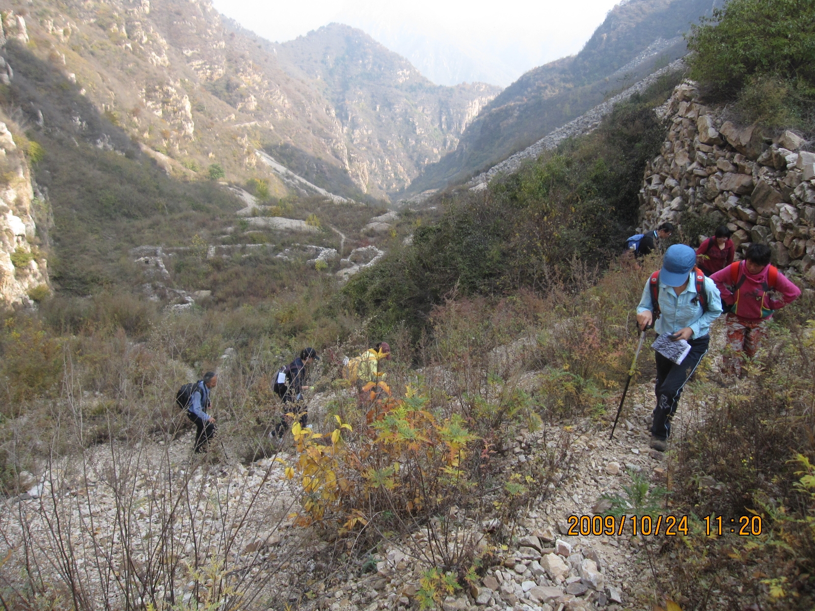 A点。左右前都有路。在老乡的帮助下,我们纠正了最初的错误选择,向右沿山脊阳面横切。山脊上草木茂密,采空形成裂缝