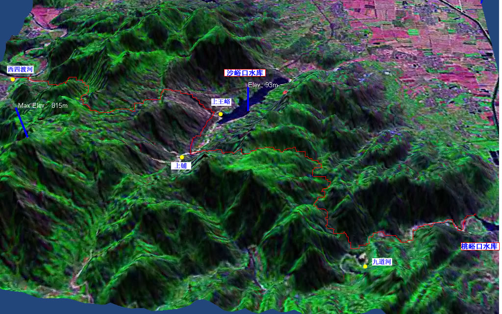 乘坐L815次列车至兴寿站下车,然后到桃峪口村包面的,至桃峪峡谷中九道口村南面的拐弯处下车。沿东侧的山谷上升,翻过桃/沙分水岭,至沙峪峡谷,沿峡谷向外走到水库边的上王峪,再沿东侧山谷上升,翻过沙-九分水岭,下降到怀九河峡谷,再向西沿河走到西四渡河,搭乘由杏树台开往怀柔的班车,到北宅,乘L816次列车返回。