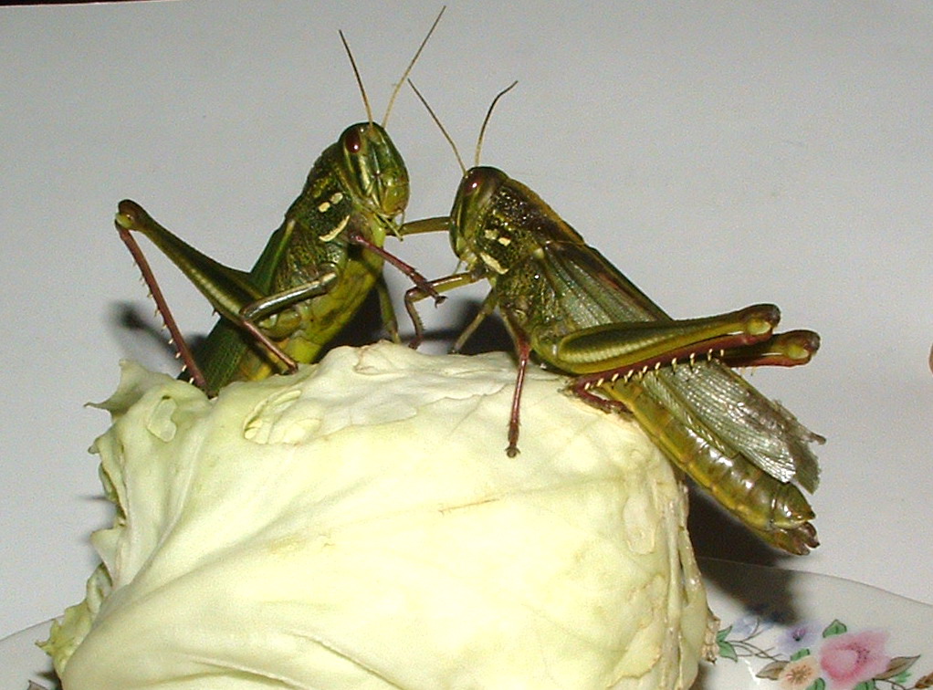 两只蚂蚱,一只叫大翠,一只叫二翠,长得很像,分不出来谁是谁,或许在他们眼里,我和史奴比也长得很像,分不出来谁是谁。把二翠的翅膀尾部剪了一点,才算有了标记。这对难兄难弟来自廊房峪到北石城的防火道边的草丛里,两人的领地相距相差约500米,也算是同乡了,但蚂蚱这种动物的社会性较差(除了闹蝗灾时),通常是鸡犬之声相闻,老死不相往来,如果不是做了我们的俘虏,他们极可能一辈子都不会相逢。跟他们一同被捕的还有一只“挂搭扁”(一种脑袋为锥形的蝗虫),还有一种棕色的中号蚂蚱,本打算在家里建一个蚂蚱家园,不料另外两只在密云县城逃掉了,幸好最漂亮的两只还在。象所有的草食类动物一样,大翠和二翠性情温和,智商不高,从小生活在饭来张口的环境里,没有觅食的本领。给他们提供的食物是一只圆白菜,喂食的方法是把他们硬摁到白菜上,让他们尝到甜头,从而暂时忘掉警惕和恐惧,再放开手,让他们自己趴在白菜上啃。这是一个很需要耐心的过程,要让蚂蚱明白你没有恶意,是很困难的。经常是摁在白菜上半天,他愣是不张嘴,拼命挣扎,用狼牙棒般的大腿使劲蹬人,一放手,他就拼命地跳开了。然后再把捉回来,再摁到白菜上,这个过程要重复好几次,直到他累了,才会老老实实地趴在那儿啃白菜,一趴就是几个小时不动窝。如果不这样喂食,他们即使饿死,也不会自己找到这棵白菜的。比起小强,比起蚂蚁,大翠二翠们的生存能力差得远。