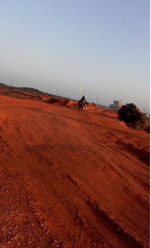 推着车,下了山丘,再上一个堵坡,我们正享受这赛道的新奇和冬日暖阳的时候,前方的山丘猛然间飞出来一台摩托车,高出地面一米以上,姐姐吓得惊叫,叫我赶紧搬车,给他们让道。我也惊叫,没想到电视里面经常看到的赛车镜头,现实生活中能有幸遇见,一个字“酷”。姐姐倒是更多地担心司机的安危。我们赶紧搬车上左边的小土堆,姐姐还紧张得滑了一下(这个我事后看到土堆边土有松动的痕迹,姐姐说了才知道的)。我预计得有几辆,赶紧拿出手机镜头对准,好想拍到摩托车冲上空中的感觉啊。但因为手机内存不够,好慢的。我没能拍到,遗憾。