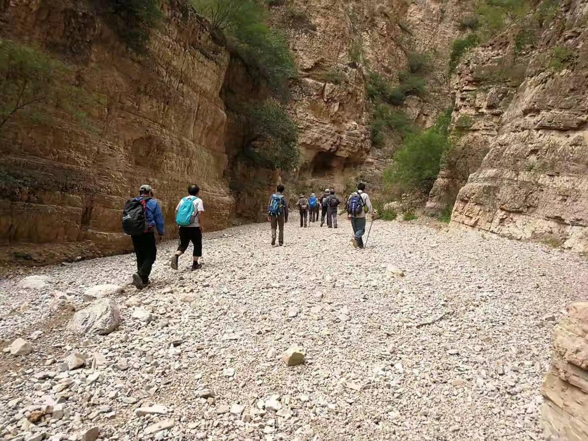 石头是绝对的主角,高处的山峰,两侧连绵不绝的垂直岩壁,脚下厚厚的碎石子,满眼都是石头,白里泛黄,偶尔有一些灌木丛点缀其间,植被主要分布在垂直岩壁上方的斜坡上,提醒你这儿不是戈壁滩。除了一个横在沟里的“壶”可以玩玩攀岩,刺激一下麻痹的神经,大部分路段的景观是单调的、重复的,沟一会儿由宽变窄,一会儿由窄变宽,一会儿向左转,一会儿向右转,就像单曲循环一首旋律简单的歌,刚开始听还感到优美,但听到10遍,你想换一首,却发现停不下来了,只能含着眼泪让它继续循环下去。其实每次徒步,大部分的路段都是这样,冗长而重复,最初的一点审美上的愉悦很快被耗尽了,剩下的时间,就进入机械行走的模式,脑子越来越麻木,脚仿佛是一个有独立意志的个体,脱离了你的控制,在自主地前进,你的脑子里只剩下一个念头:还有多少公里啊。