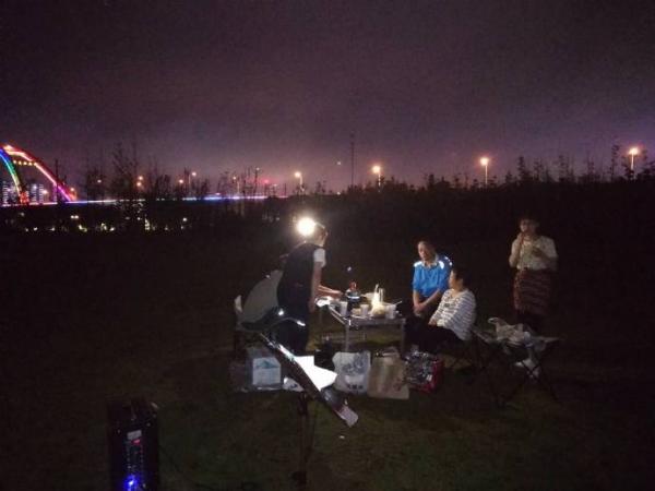 我们散坐在草坪上,煮茶唱歌,闲聊八卦,年轻时弹过的吉他,在这个月夜弹起很是应景,医生的即兴《月亮代表我的心》弹奏让我恍惚回到青葱岁月。