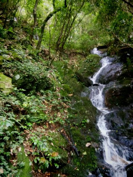 过溶洞取水口后,便完全溯溪而上,大概要跨越小溪十余次,溪面不宽,但要在不湿鞋的情况下跨过,必须踩着水中石头才能过,而垫在水中的石头不大又不稳,极易打滑落水,须谨慎小心。我们就湿了鞋,在回程中,柳暗花明还滑坐水中,湿了身,情急之下,甩掉了登山杖,关键是还找不到了。
