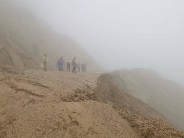 我们穿行不同路径下至山腰一处工地处,因大车碾压,泥泞难行。还迂穿了一处巨大的沙山,高达百米,上不见顶,下不见路,沙山被水冲刷成条条谷沟,众人唯恐沙山滑坡,深感恐惧,急忙后撤。又走了2公里泥泞路,着实难行。