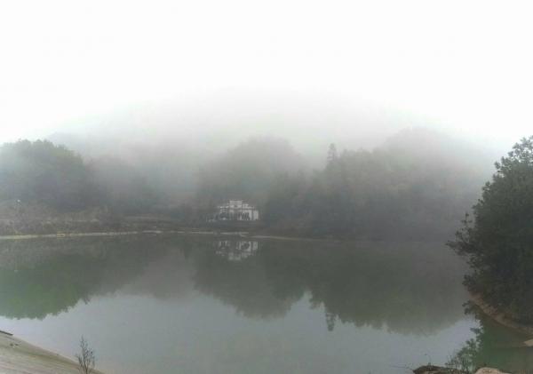课题如期按计划进行。山下清冷阴沉,山上云缠雾绕。徒步在云里雾里中缓慢上升,又缓慢下降,整体节奏不快,强度也不大。先是很好走的砂子机耕道至山腰,远处升腾起一层云雾,山尖漂浮在云层之上,仙气飘飘;透过云雾窥探,山间黄绿斑驳,山下阡陌交通,屋舍星罗棋布。