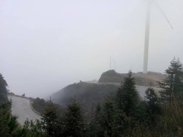 再上,便是风电大道,大雾茫茫中,巨大的风电车若隐若现,发现强劲的轰鸣声。有毛毛细雨飘落,大部分人都撑起伞来,蓝虹、木瓜自恃以冲锋衣牛B,功力强大,硬挺着,多次提醒穿 雨衣,但就是不穿。一身湿漉漉,直到中餐后才穿上雨衣。
