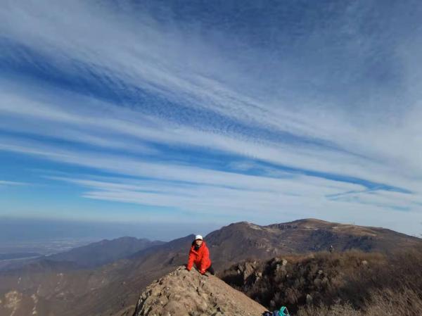 虽然城市笼罩在雾霾下,然而山顶空气清新,鳞状云与飞机尾迹交织,变换莫测。远处的山重峦叠嶂,幽静深远。海坨山冬奥运的两条雪道清晰可见,像洁白的哈达挂在天边。