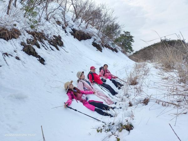 沿村村通前行5里,便是急升的机耕道,是村民砍竹子开的,极大的方便了我们的爬山活动。路上渐有积雪,大家很高兴,越往上爬,积雪越来越多,我的网面鞋已开始进水;到达800米高处,是一段背阳路,积雪很深了,鞋已深陷不见;一处水流将雪路冲成两段,女人们就在雪地上撒起欢来。我的鞋子全湿透了,我想山上的雪会更厚,再上爬肯定是湿不可救的了,犹豫着要不要下撤,找个溪谷玩下算了。试着问了一下,柳老实响应着,其余三人对爬雪山兴致很高,我也就半推半就的说继续爬吧。