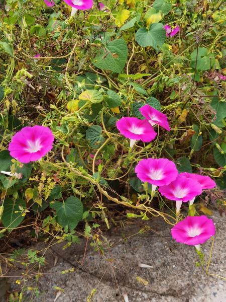 山中有雾,远山可见,云雾缭绕,村庄隐隐,山形走势一目了然,唯独差了秋阳高照。山中野花遍地,牵牛花开得十分艳丽,粉色较好,给人以愉悦之感;紫色太暗,给人以压抑之觉,不甚喜欢。