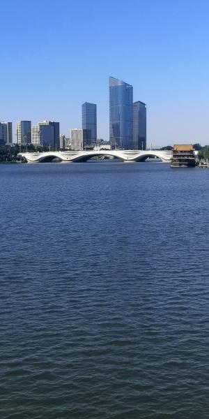 骑行道修的很好,河面宽阔,水波荡漾,天蓝水清,让人神清气爽。
