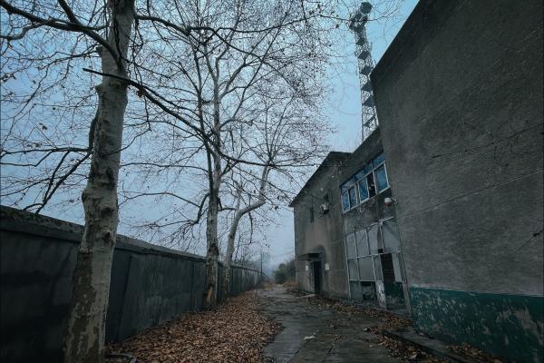 从陡坡下来,旁边还有一条类似腰线的道路。走了1公里到尽头是一个废弃的院子,有铁门,有信号塔,油机房,还有办公楼,不过都是人去楼空的样子。院子另一头有个小门,有陡峭的台阶,还有一段铁的栏杆,台阶很长,到了尽头,发现有很多的废弃房屋,有点像历史久远的的部队营区或工厂厂区。在一个宣传栏上,还依稀可见黄色涂料写的公告。院子里有食堂,还有篮球场,当年应该是很风光的样子,现在只剩下断壁残垣。有人曾经到这里探险过,在墙壁上留下了各种文字。