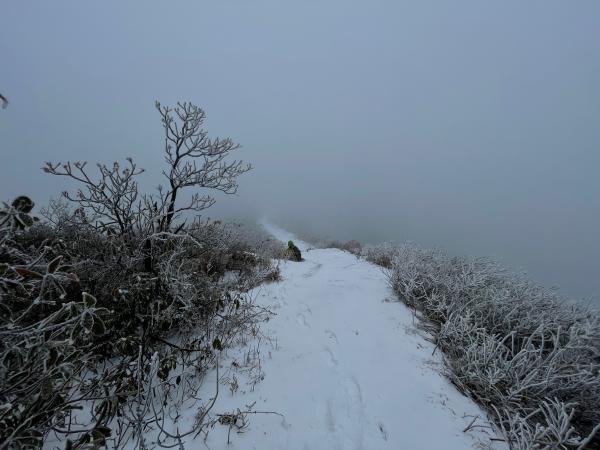 7:05自驾出发,7:30与丁果老师会合,8:40课题开启,9:05八尺坳玉池林场入口上山。第一段上玉池山脊看雾凇,越到高处风雪越大,雾凇也越壮观。站在山脊,四下里望去,风雪中的能见度也就百来米,颇有混沌之感。丁果老师说看到这么壮观的雾凇,这趟出走值了。