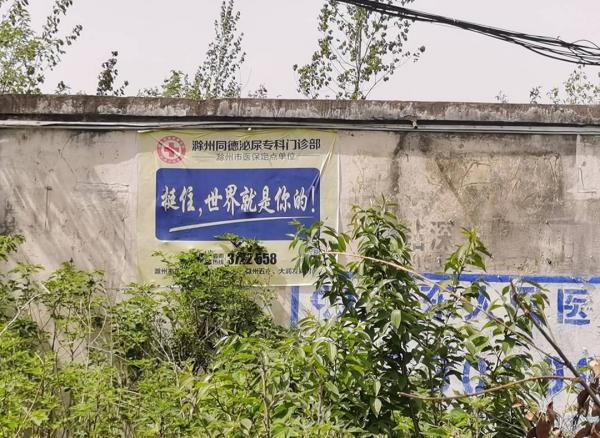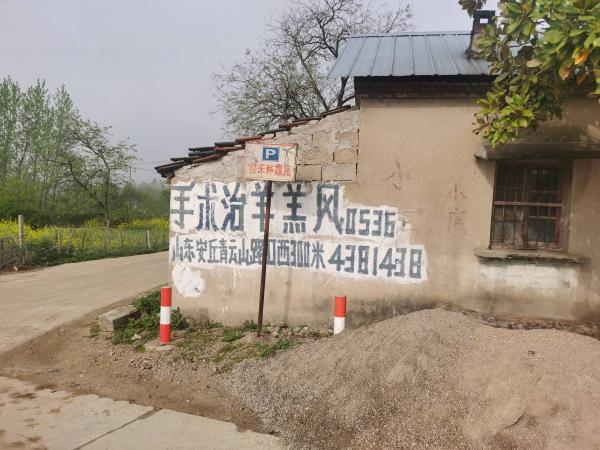 离开镇子,左转,沿一条水泥路前进,两侧开始出现小山,遍植松树,正是我当年在火车上看到的样子。路边农田里,立着一个水泥广告牌,上面写着手术治疗羊羔风,医院在山东省安丘市,距离不算近,很好奇这样的广告成本多少,转化率怎么样。后来,在1.5公里外的一面墙上又见羊羔风广告,我开始怀疑这一路都要与羊羔风广告相伴了,就像当年的“紫荆关家具城”一样。