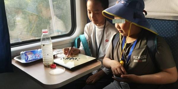 进站后没几分钟车就来了,大家鱼贯上车,将空余的座位基本填满,因为不对号,所以大家尽量分散在各个车厢,这回没有空余车厢了。两个小孩车上一路下棋,一瓶子蝌蚪陪着他们游来游去。