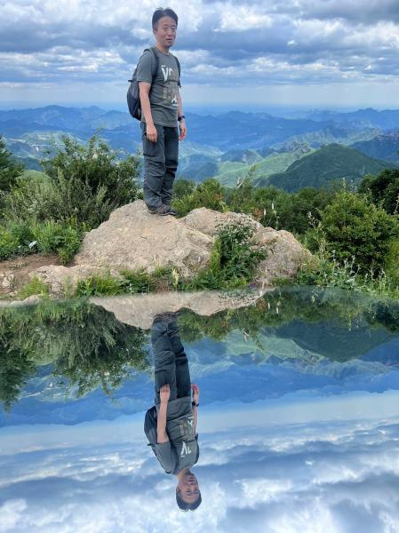 再继续往前(南)走,是通向五指峰的路。先经50米陡升(牌子上写的天梯),后面有缓有急,全程木栈道。上完天梯,相伟腿抽筋,他打算在原地缓缓,等我们返回时一道下山。我和文昊13:40到达五指峰,海拔2017。5分钟后,相伟突然出现了,哈哈,那份惊喜!我俩家住得近,每周都见面,没有哪次像这回见他叫人安心和开心,这回圆满了。他说吃了火腿肠,就不抽筋了,相当于补了电解质吧。五指峰上俯瞰群山与大地,碧霄旷野给予的坚定与辽阔,让人血热。