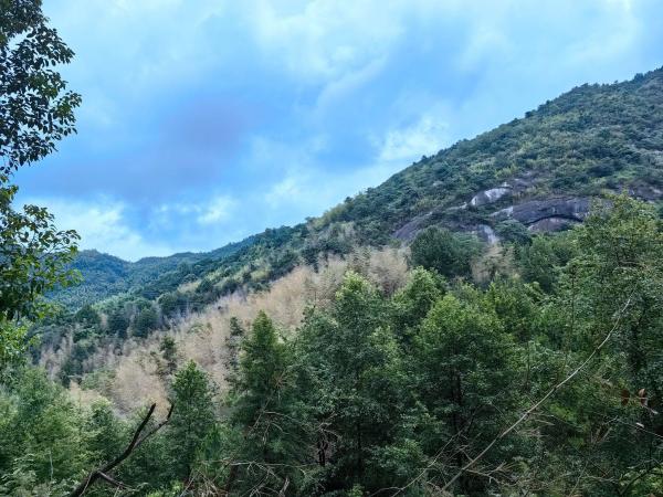 山谷中一片沼泽地,顾不上湿鞋了,直接擂过去,在山谷边,爬上一片竹林,穿过之后,总算来到了山脊上的毛路,似乎很好的路。