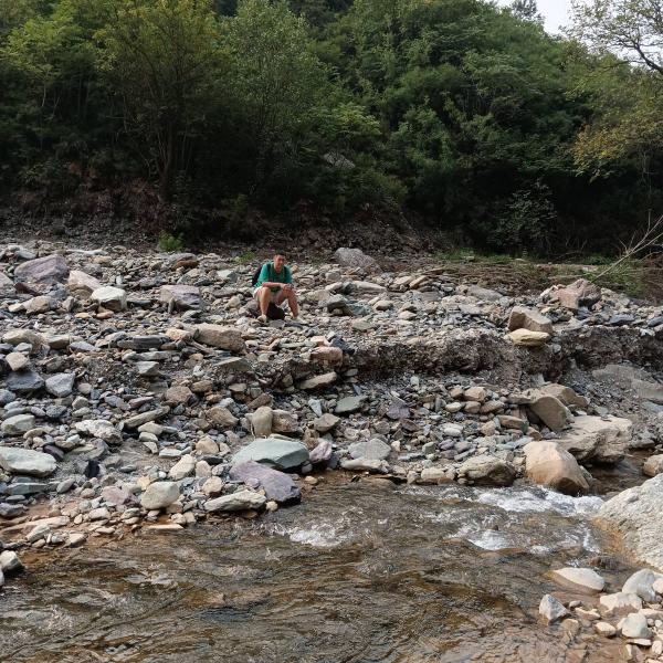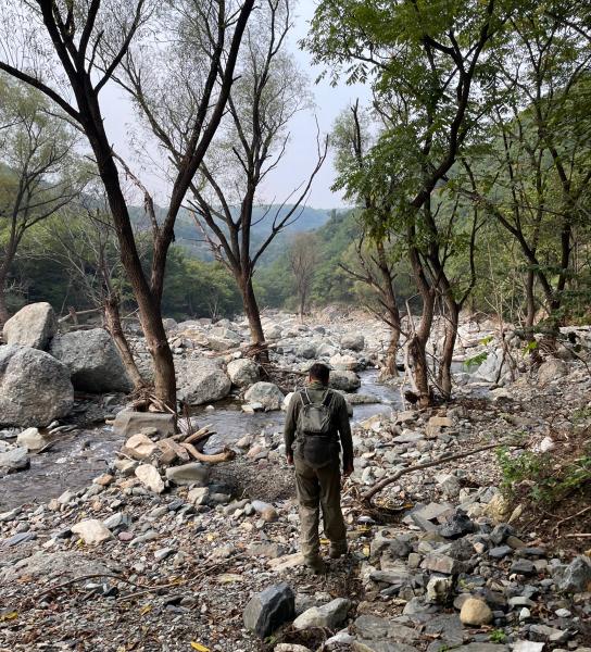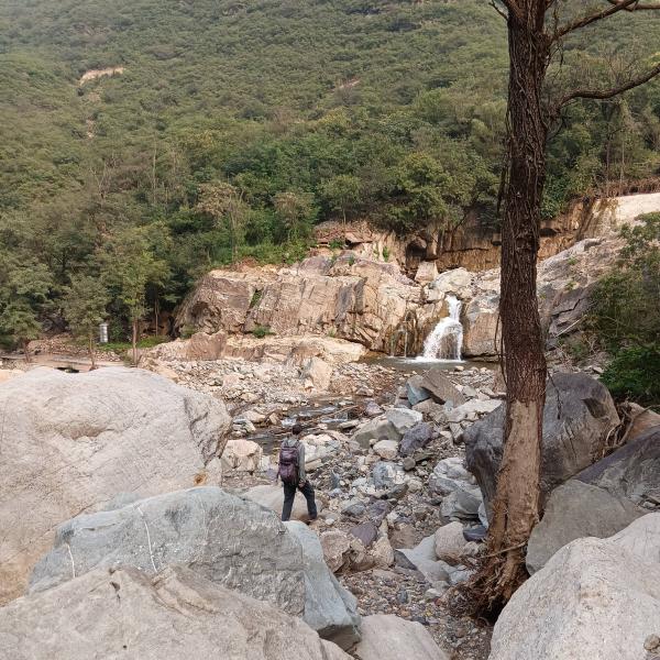 进入到瓜草地风景区路段,瓜草地以前是古道悠悠,溪水潺潺的景点,731这天就这样瞬间消失了,展现在眼前的是一片片石海。再往前路整个就坍塌了,不得已只能下降30-40米的悬崖,那对我来说就是巨石阵,羡慕大长腿们可以在石间轻松跳跃,没南哥的指挥我是真不去,南哥知道我不恐高也放心不少。