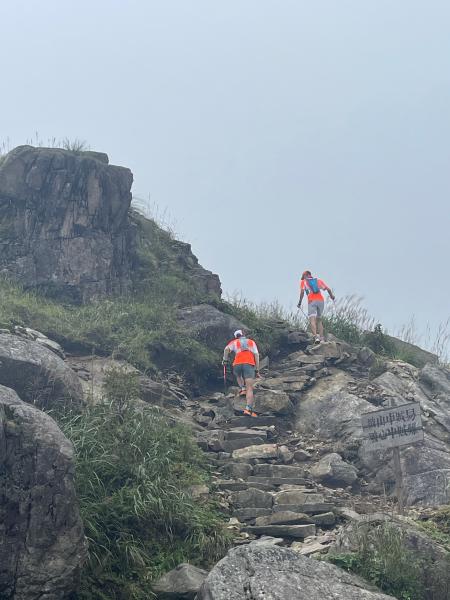 9:50 马头山海拔600,几个高翘的山脊,急促陡升至铁蹄峰海拔1860,主要考验的是攀高;其路迹是清晰、干净,稀有人至;青竹林、松树林、高山草甸依次更迭。铁蹄峰处,景色变化如幻,若高若低山峰,万丈深渊的断壁深崖,忽浓忽淡、突隐突现的云雾,山廓气象千万;黄草甸、白雏菊、粽草籽、翠松柏,似随意涂抹的调色板;一群以“清洁山野”为号召,网约来自南京、杭州、深圳的年轻人,背负着一袋袋山上抛弃的矿泉水瓶等垃圾送下山;着同款越野跑者,飞速金顶。