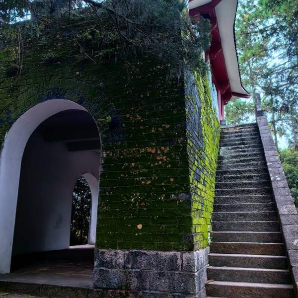 光泽县城也被几条小河小溪分割成几块,所以,没有直达线路,七弯八拐之后,终于来到了九龙峰大门口,一个中年男人超过了我,本想搭讪问一下远处那个山的信息的,但我无力超过他,只得慢慢上山,有台阶路曲折而上,整个山中只有我一人的感觉。