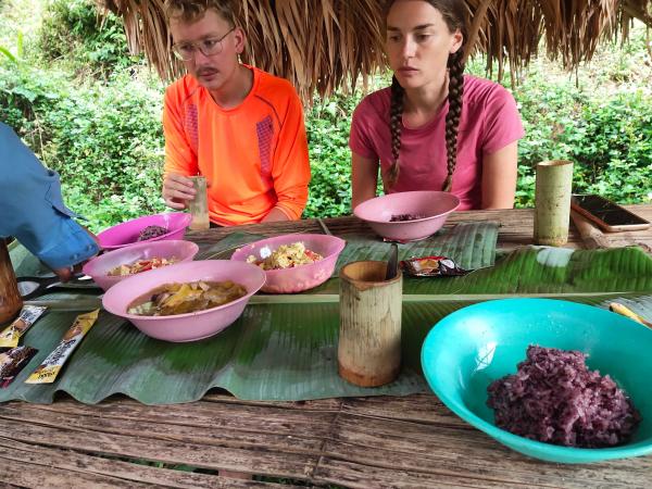 很遗憾,我没有坚守勇于探路的风格。到了琅南塔后,找了个店交了大约 50 美金的 kip 就等着第二天集合拉走。这次选的是 3 天的行程:1 天 homestay+1 天 camping,最后一天回程。 同行的是一对法国情侣和一个老向导。后来聊天得知,情侣们是第一次来原始森林徒步。