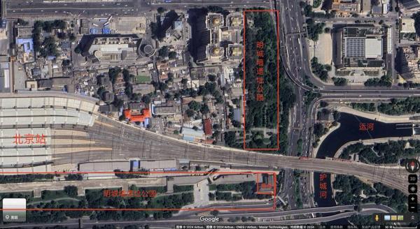 遗址公园被铁路分为南北两段,南面的东西向,北面的南北向,以角楼为界。