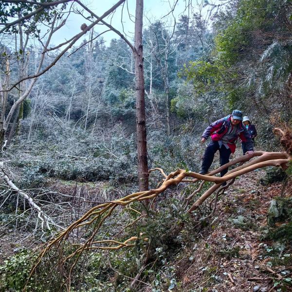 中锅棚午餐后,我们开始上升,过一个山脊,经过了一处油茶提质改造基地,它搞了三年了还没结果,但终于见到有水土被冲刷的现象了,我们不懂改造方面,只是用外行的方式在边上指指点点一下就离开。