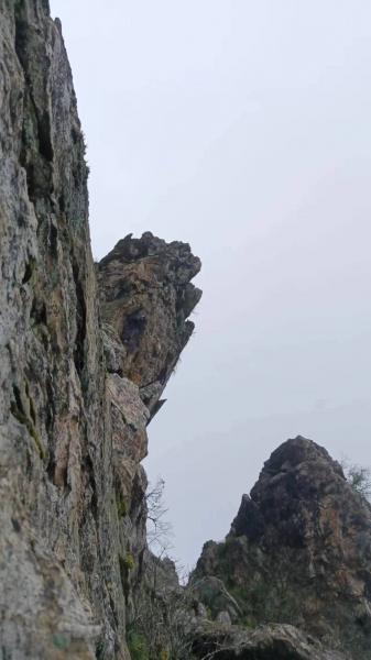 别的山单个石头,高挂山一列山都是,像整体一排。到顶一段要钻林子,站在钩岩下,高挂山精华尽收眼底,怪石嶙峋。