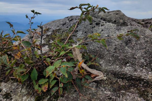登山小径起初是麻石砌成,宽约一米五,人工开凿,并不规整,且只铺了数十米,之后便是土路,隐入竹林。随着高程不断升高,植被也逐渐发生变化,从低处的竹林到高处的松树,回望身后,山下的民房已经如火柴盒般大小。查看了两步路上的轨迹,登山路口到只角楼的路程约7公里,但爬升有1000米,其陡峭程度可想而知。在海拔1080米左右,小径从林中穿出,最终与一条防火道汇合。抬头望,上山路都是巨大花岗岩,怪石嶙峋,几乎没有树木生长,仅有不多的矮小灌木和杂草。