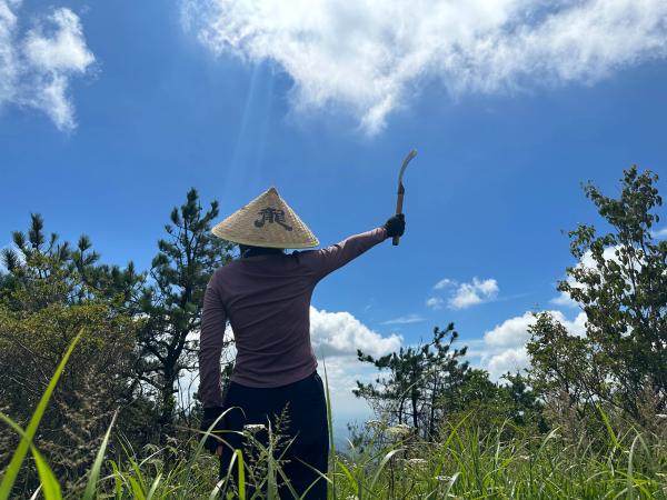 吃过路餐稍事休息,13:00准时出发,顶着烈日,在光秃秃的山脊防火道上笔直向上,把蓝天白云甩在身后,享受汗流不止的爽快。到了丫髻尖,大家借着忆梦姐的黄龙寺斗笠,狠狠做了一回自己的龙大侠。