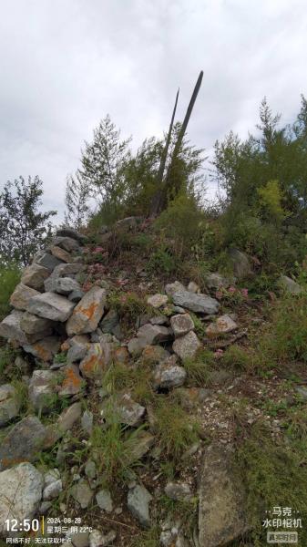 到了山脊就是松树林,路发散草丛有点密,摸索着走不起速度。松蘑很多可惜无缘享受。12:50到了大平台一根木杆山顶。下撤走沟很爽,发现一座砖砌敌楼可见到三面墙,下半部分砖块已成粉末。沟底一棵树下有个洞,深有60厘米,溪水从里面冒出,看来是个季节泉,从地貌植物判断不像长久泉。走了一公里又遇到了一座石头屋轮廓 后面巨高石头堆,明显是古迹。之后又遇到石头长城,还有两块白河堡自然保护区木桩。遇到一个放羊人40多岁姓陈,他有200只羊,去年收购价13元一斤。那个酒庄故事是他告诉我的。他的裤子膝盖处磨了很多洞,我说买个军裤挺好,他说迪卡侬比较结实。