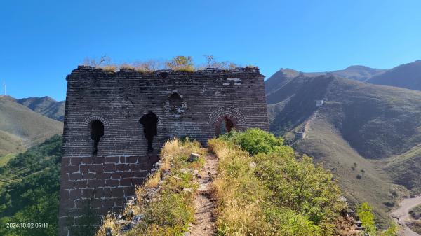近年来,卢龙县对刘家口过水关楼进行了修缮。我们由此上山,一队东行,天上碧空云淡、晨光熹微,左面矿坑裸露、风车懒转,右边车辆咫尺、行人宛然,前路墙体连绵、燧楼接续。