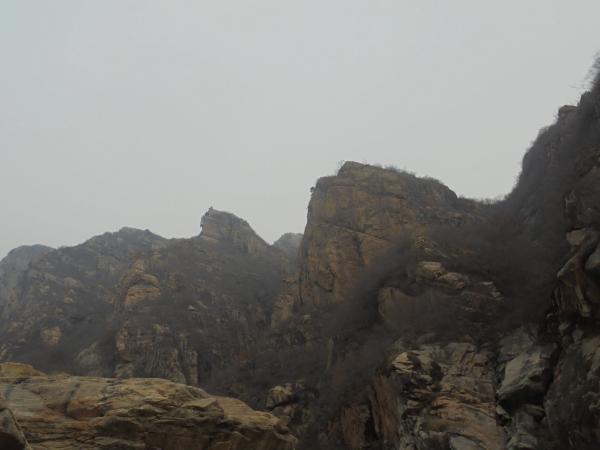 6.墙体7以西至775高地,山脊进入白道峪与牛盆峪之间最为险峻一段,流云淤滞,无存逾越之通廊,鹰隼旋落,难有筑巢之罅穴,走友需寻觅节理裂隙方可从重重迷障中侥幸突破。自墙体7西端循小径陡升,不远困入一裂隙,上仅以一小断崖同天穹连通,此即为本路线最大的难点所在,小断崖高度不高,岩壁也并非垂直,走友从左侧借助岩点可攀爬而上,但这里的岩壁较为光滑,且岩点很小、不容易发现,攀爬难度较大,攀爬经验一般或雨雪季节,走友需借助绳索方可安全通过。