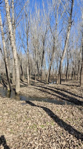这一大片树林铺满落叶,落叶下面的土松软潮湿,两条溪在树林里交汇,构成一片湿地。换个季节,可以来此扎营。