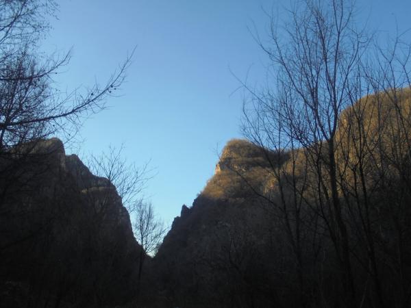 在撂荒田地前方左转,沿野猪窝东沟下行去往东直河、龙庆峡一带,此后约3.8公里路,走友从众神的脑瓜顶来到众神的脚趾缝,虽与苍穹与飞鹰渐行渐远,但那冬日倾斜的光照,打在深渊与层巅之间,创造出极致的二分世界,沟谷深处的行人,穿梭于光影,时而温暖,时而仰望,震慑、驻足、惊叹、追寻,仅是在转瞬之间。而在路况方面,野猪窝东沟路线则可分为上下两段,上段路线为沟谷两侧的成熟小路,走起来很是舒适,可谓龙庆峡断块山地中不可多得的景观大道,而下段路线虽旧时开辟有简易机耕路,但在历年山洪中已基本被冲毁,如今走友沿流石滩蹦跳而行,膝盖、脚踝需要注意扭伤风险。
